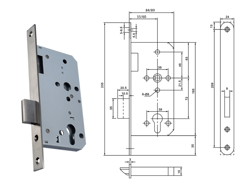 Stainless Steel 304 Mortise Door Lock Body Assembly