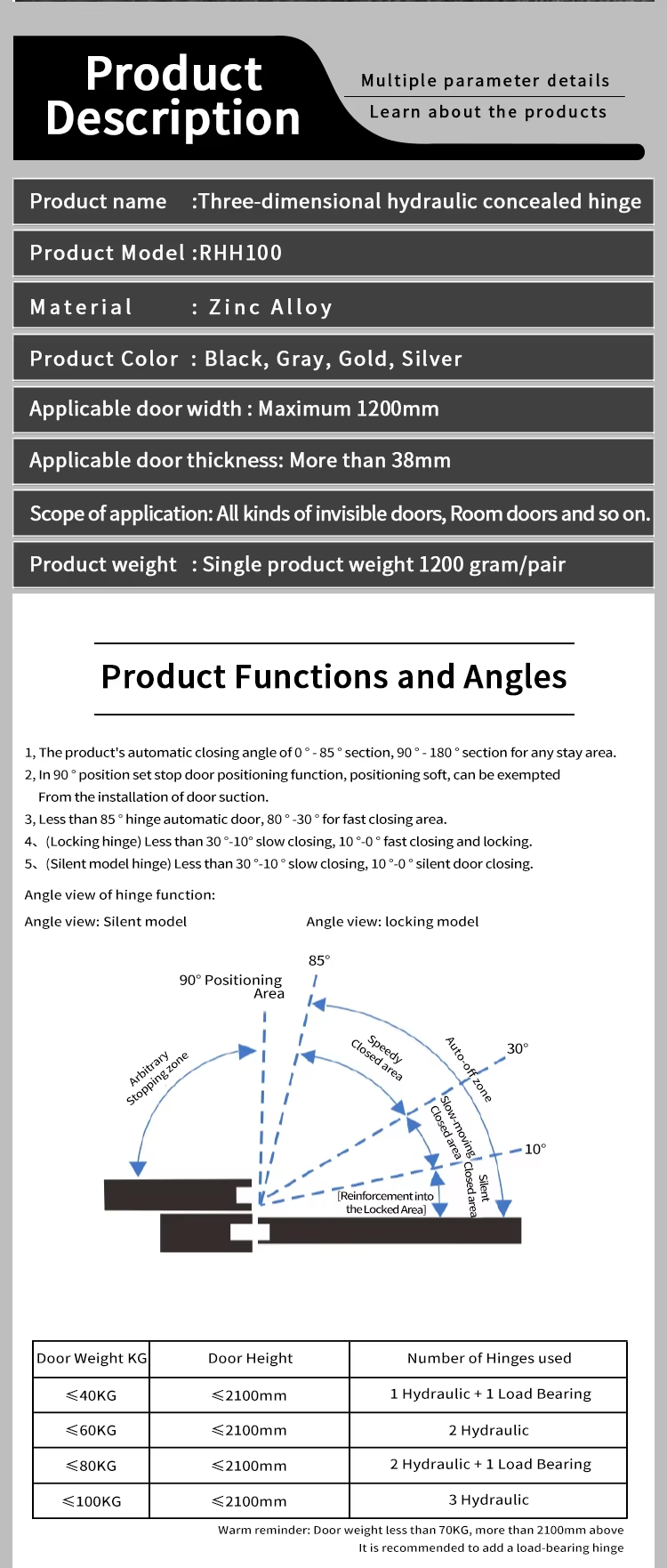 RHH-100 Heavy-duty 3D Adjustable Concealed Hinge 100KGS Maximum Loading Capacity